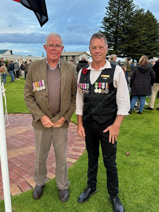 ANZAC Day service organiser Bob Grieve wore his fathers WW2 medals with Peter Hill who recited the Ode to Remembrance during the service.