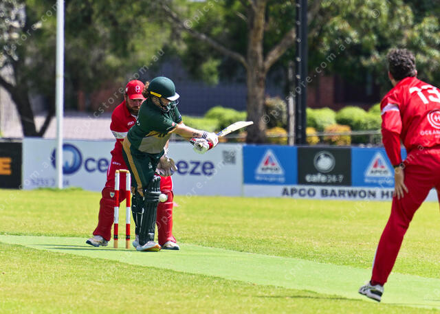 Jess Croker plays across the line and is hit on the pads (Ivan Kemp) 448454_11