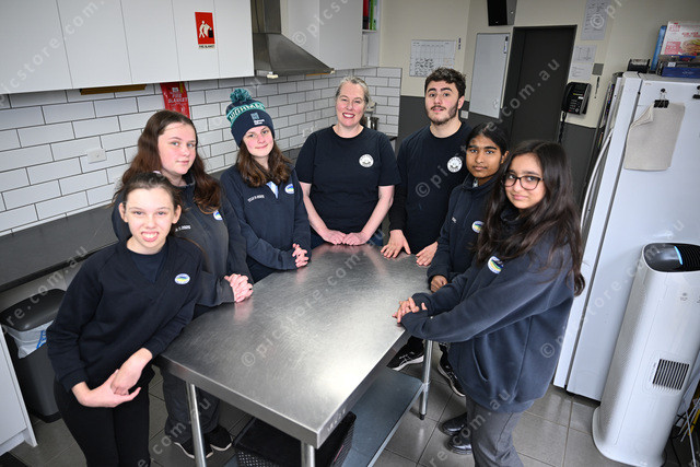 Brookeside College, Caroline Springs, renovated kitchen. Pic of artisan teacher Sonia Martinovic with students: Tahlia, Maddison, Caitlin, James, Sahaana and Leana. Photo by Damjan Janevski. 483655_04