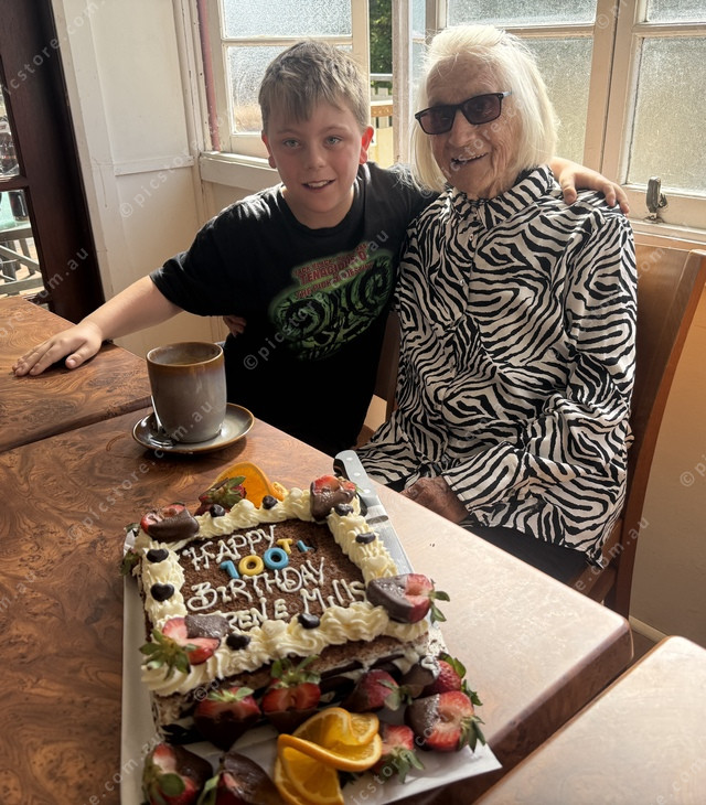 Callum Mills, 11, gives his great-grandmother a hug on her 100th birthday. (Larraine Sathicq: 511284_02)