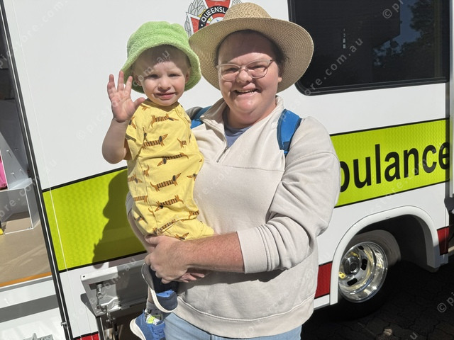 Noah Wilkie, 2, checks out an ambulance with his mum April. (Larraine Sathicq: 491020_12)