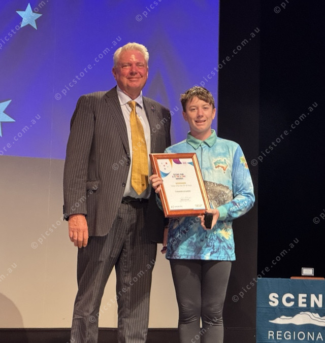 Mayor Tom Sharp with Citizen of the Year (16-30) recipient Typhoon Le Garde at the 2025 Australia Day awards. (Larraine Sathicq: 528687_01)