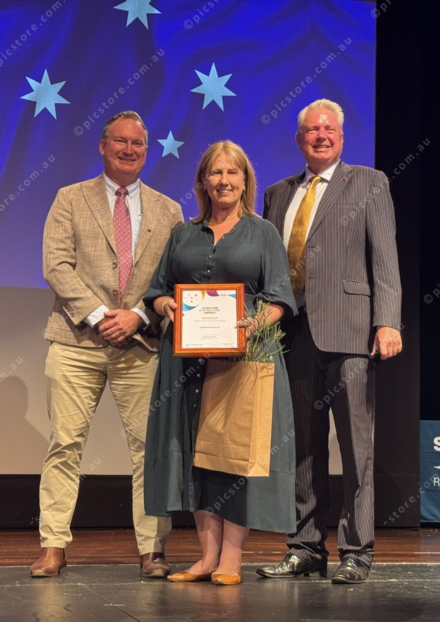 Cr Steve Moriarty with Citizen of the Year, 31-65 years Janine Rockliff and Mayor Tom Sharp. (Larraine Sathicq: 455627_06)
