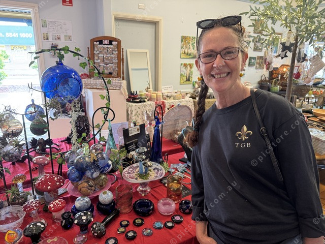 Tamborine Mountain glass blower Faerie Fleur at the BADCAP Christmas Makers Market with some of her work. (Larraine Sathicq: 447224_18)