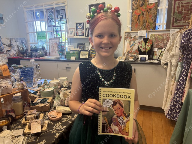 Tania James, 10, checks out the Knitting Nanas against Gas cook book at Stationmaster House. (Larraine Sathicq: 521858_11)