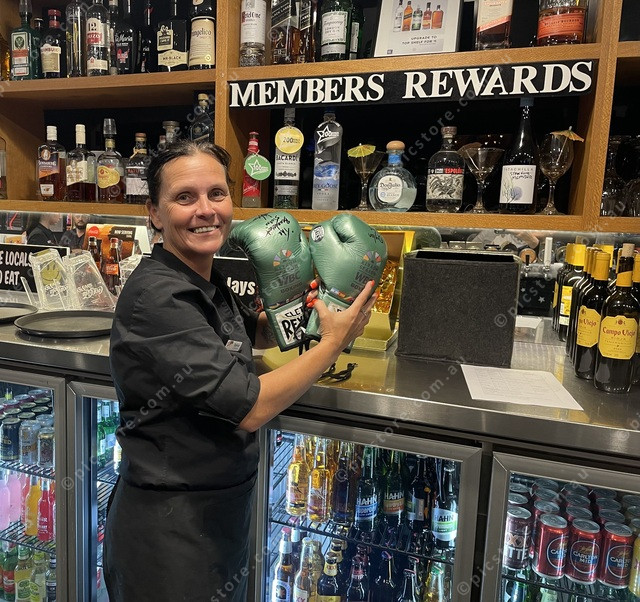 The Railway Hotel’s Katrina Wright with the Biggs boxing gloves. (Larraine Sathicq: 517492_07)