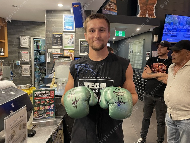 The boxing gloves worn by the Beaudesert Storm in the WBC championships will be raffled at the Railway Hotel next month. (Larraine Sathicq: 517492_11)