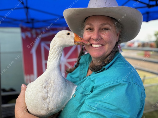 Geese can be friendly too! Guest Ranch Mobile animal farm owner Tracy Guest, holds Snow dearly.