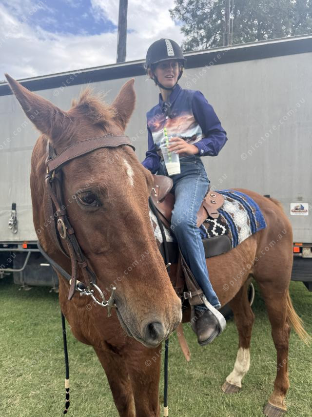 Deanna Stenhardt of Rathdowney Pony Club astride her grandfather’s horse Surfie at Beaudesert Showground. (Larraine Sathicq: 471715_11)