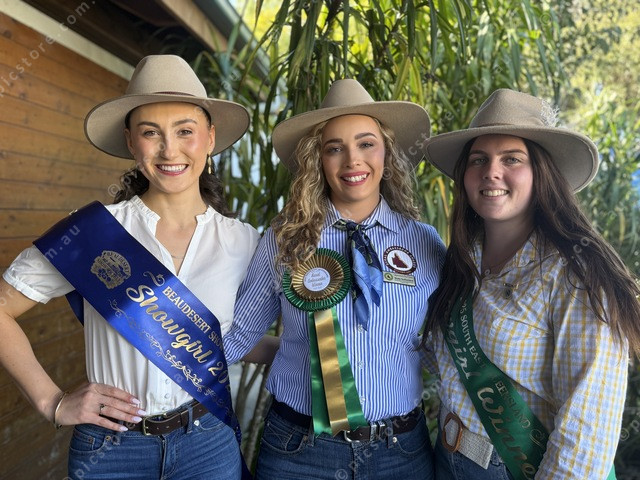 Beaudesert showgirl Poppy-Jane Todd with SEQ rural ambassadors Shale Sutherland from Canungra Show and Megan Reid from Mudgeeraba Show. (Larraine Sathicq: 498133_07)