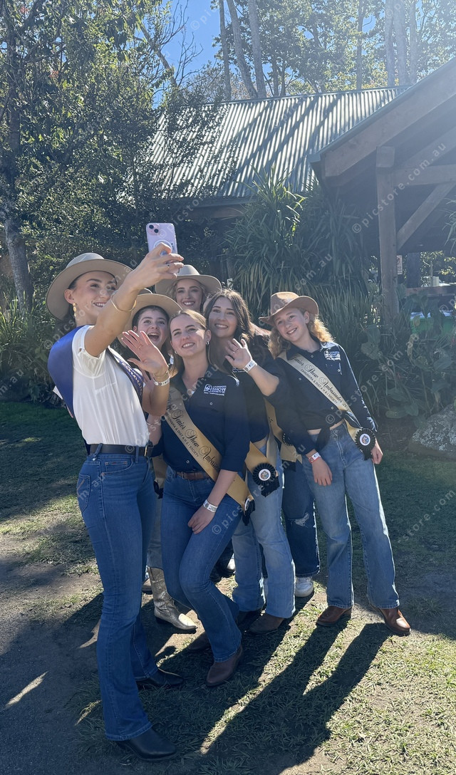 Beaudesert Showgirl 2025 Poppy-Jane Todd takes a selfie with the Canungra rural ambassadors. (Larraine Sathicq: 498133_10)