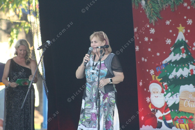 Cr Jennifer Sanders speaks on beahlf of Scenic Rim Regional Council at the Beaudesert Chamber of Commerce Christmas carols in Jubilee Park. (Larraine Sathicq: 522850_20)