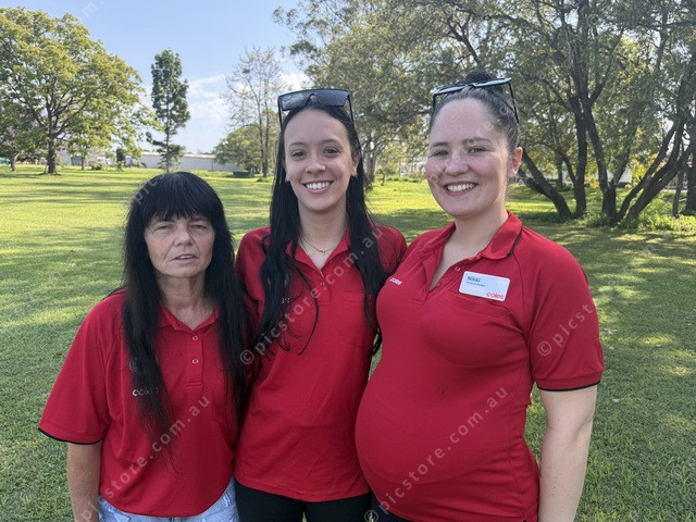 Coles managers Kathy George, Riley Chenoweth and Mikki Manns ready to run with the kids in the banana relay. (Larraine Sathicq: 516113_14)