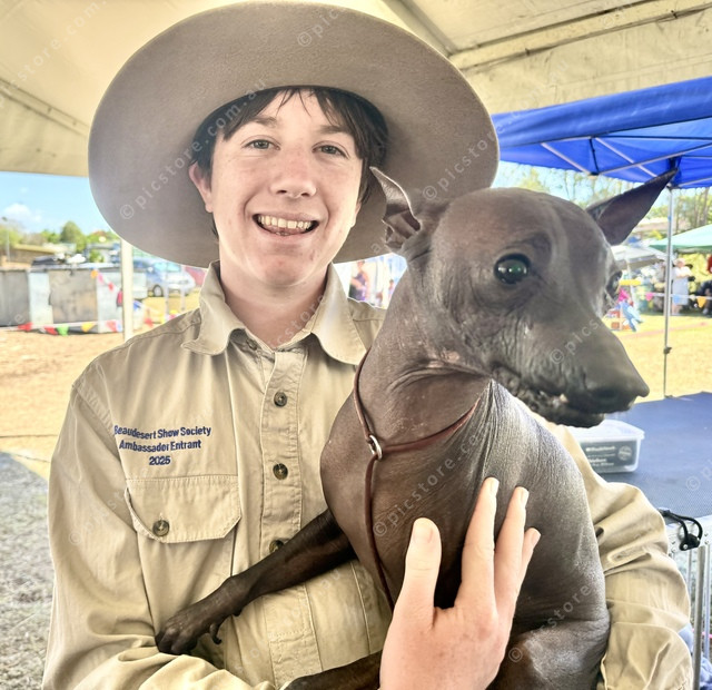 Typhoon Le Garde takes a break from Rotary Club volunteering to meet a new Peruvian hairless friend, Munkee, who came all the way from Finland. (Larraine Sathicq: 508306_06)