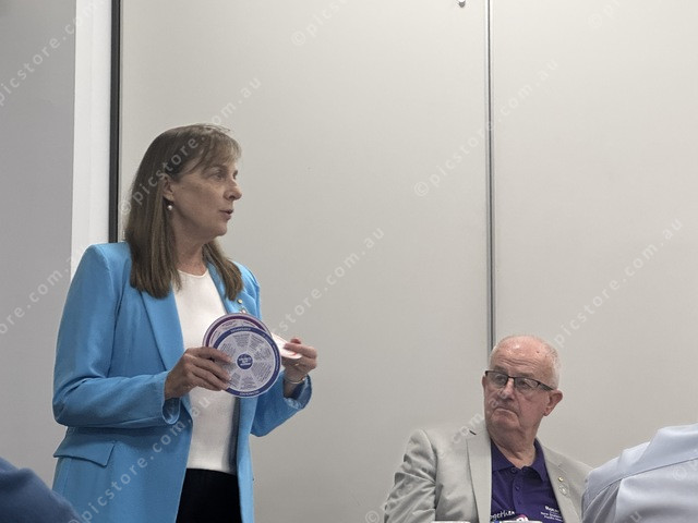 Vanessa Fowler, seen here with co-chair Bob Atkinson, speaks to Beaudesert community members about DV prevention. (Larraine Sathicq: 462576_01)