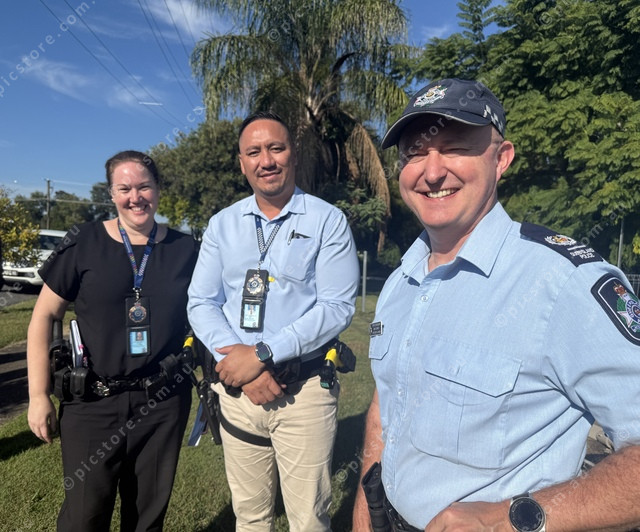 Detectives Stephanie Tyler and Benjamin Puia joined Beaudesert’s Senior Sergeant Ken Murray for the DVF march on 25 May. (Larraine Sathicq: 480187_13)