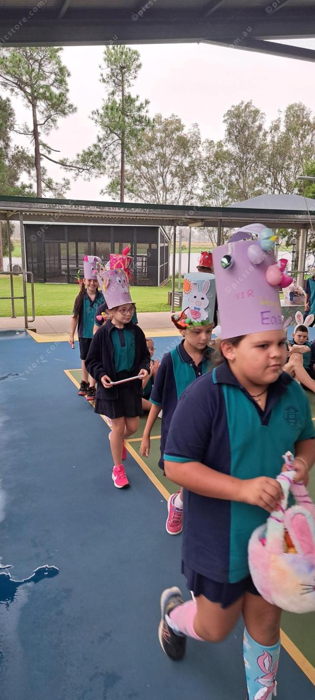 Lamaya Currie proudly leads classmates in the Tamrookum State School traditional Easter hat parade. (Picture supplied)