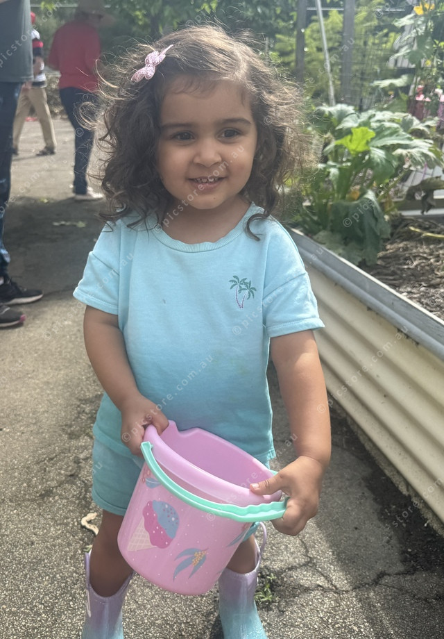 398564_07 Serena Baldwin, 2, hunting for Easter eggs in the community garden. Picture: Larraine Sathicq