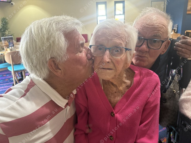 Sons Wayne and Glenn deliver kiss their mum on her 100th birthday. (Larraine Sathicq: 503272_10
