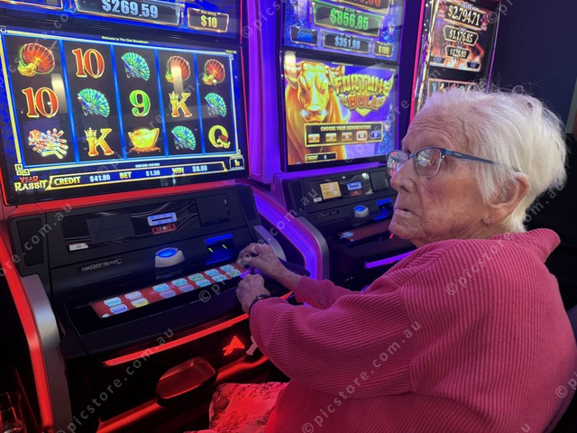 Glenys Browning has a cheeky flutter on the pokies for her 100th birthday. (Larraine Sathicq: 503272_16)