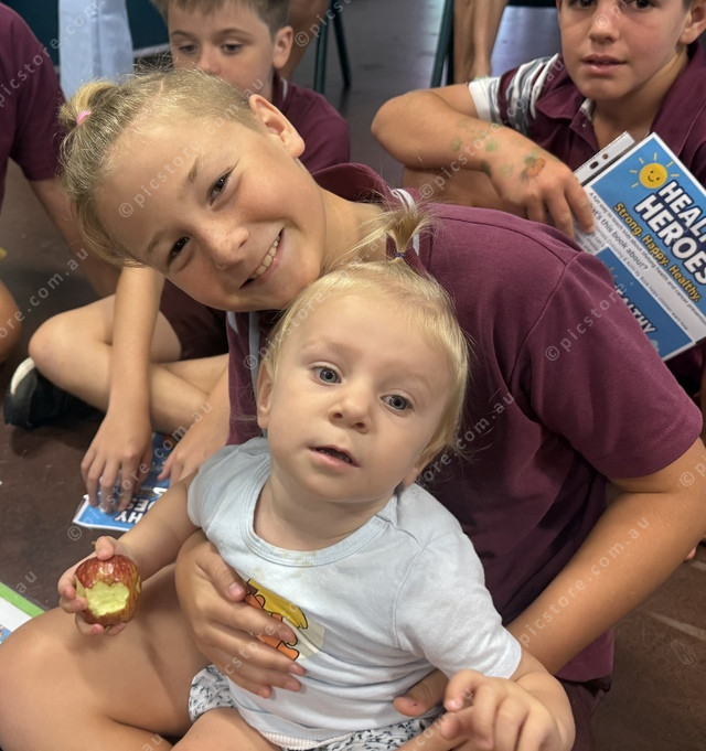 Dustin Leadbeatter, 10, was pleased to cuddle his 18-month-old sister Wren during school assembly. (Larraine Sathicq: 514776_03)