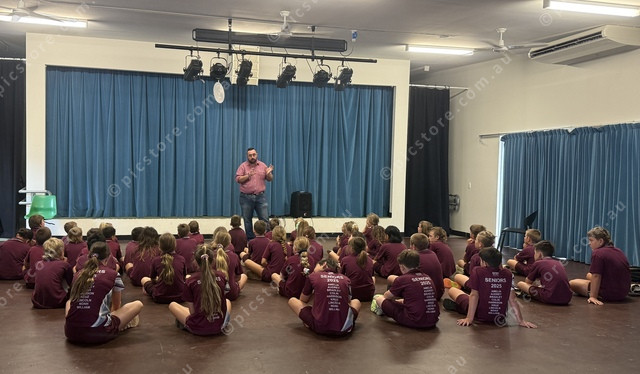 Principal Kroll introduces a special guest to Rathdowney State School students on 3 November. (Larraine Sathicq: 514776_06)