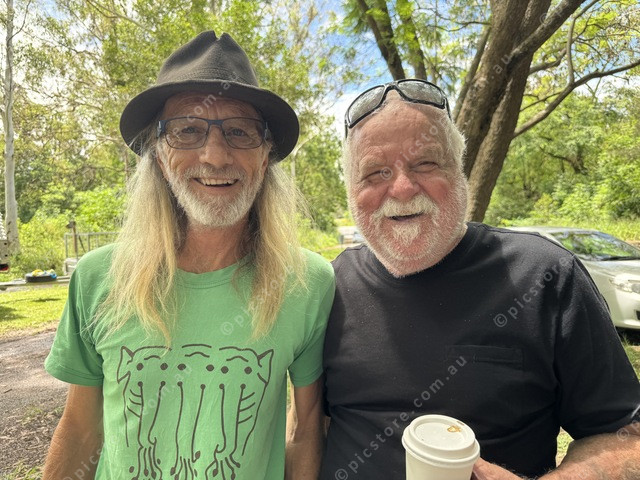 Allan Imhoff and his mate Grumpy Gardiner catch up with friends and neighbours at the Kooralbyn Hitching Rail. (Larraine Sathicq: 453185_06)