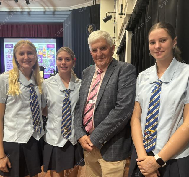 392556_11 Boonah State High School student leaders Klancie Sultmann, Kasey Payne and Emma Martin with Cr Duncan McInnes. Picture: Larraine Sathicq