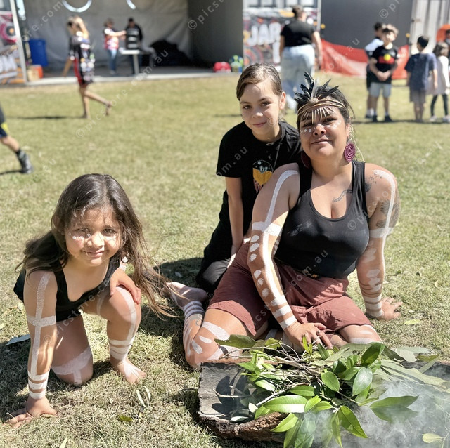 Amoura Sharpe, 6, with Zara Sharpe, 9 and Waylene Currie at the Mununjali children’s day in Beaudesert. (Larraine Sathicq: 499783_01)