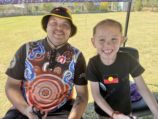 Kane Willis and Destinie Bell made badges at the Mununjali children’s day event. (Larraine Sathicq: 499783_09)