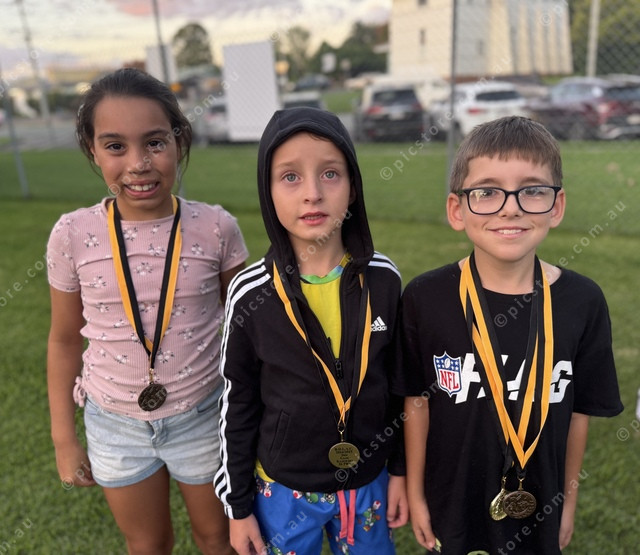 Bronze medalists Harmony Sly, Liam Kajewski and William Thompson at the Beaudesert Little Athletics awards, (Larraine Sathicq: 470254_30)