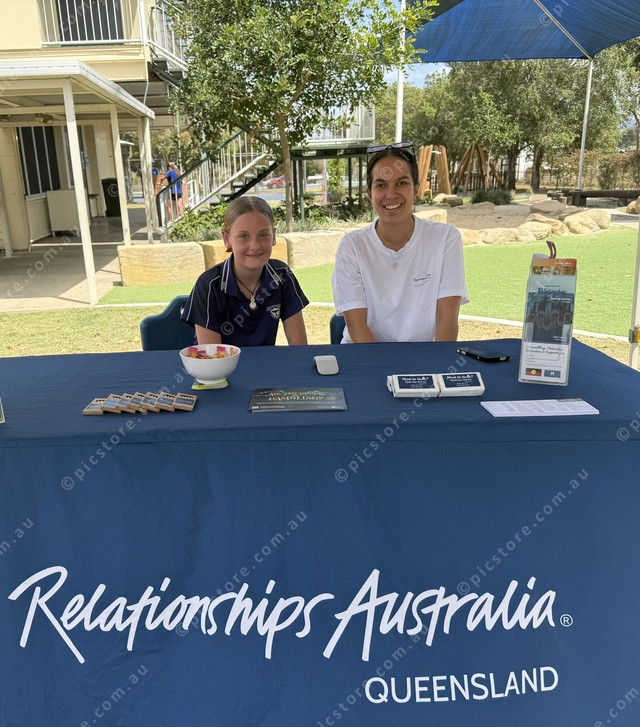 Gleneagle student Missouri Evans catches up with Dayna Stevenson from Relationships Australia at the school’s Mental Health Week community event. (Larraine Sathicq: 509668_03)