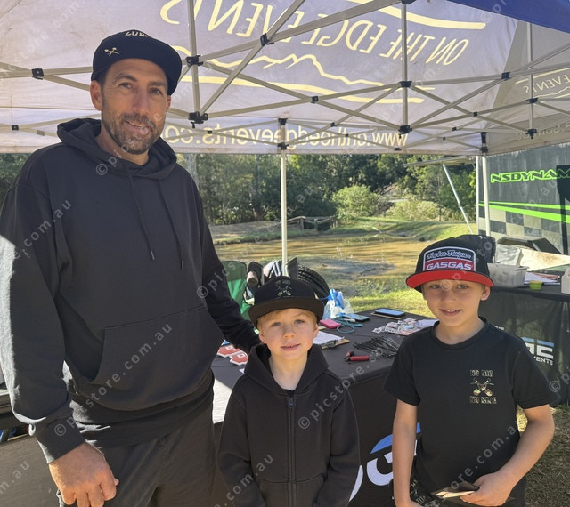 Trailbuilder Andrew “guru” Guerry with his sons Logan, 5 and Koby, 7 at the Kooralbyn MTB festival. (Larraine Sathicq: 505061_08)