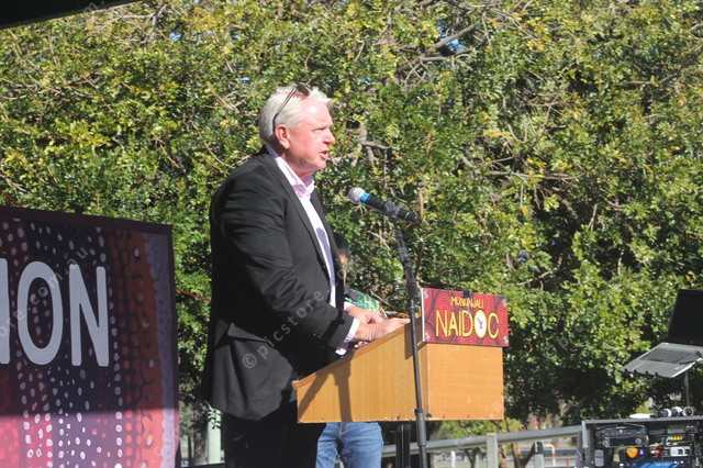 Mayor Tom Sharp addresses the crowd at the 2025 NAIDOC Week event in Beaudesert. (Larraine Sathicq: 488522_18)