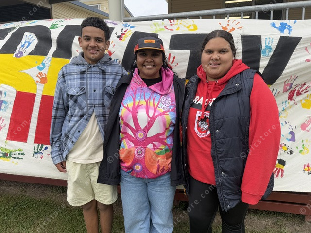 Sean O’Leary, Stacie Fogarty and Allanah O’Leary represented their Mununjali community at the Veresdale Scrub State School NAIDOC event. (Larraine Sathicq: 495198_16)