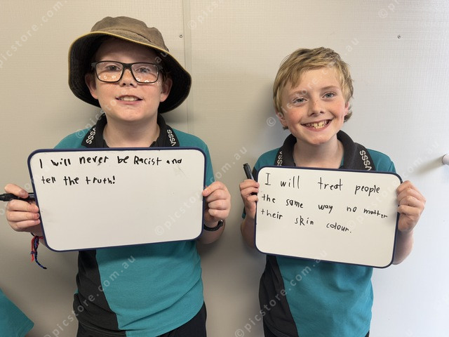 Karac Berry, 10 and Zed Crawford, 11, made signs declaring their stance against racism. (Larraine Sathicq: 495198_20)