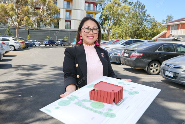 Tammy Nguyen (CEO of Vietnamese Museum Australia) with the model of the museum building _Ljubica Vrankovic_460726_02