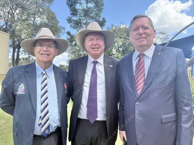 David Kassulke, Mayor Tom Sharp and John Brent pay their respects at the Palm Gardens memorial on Peacekeeping Day. (Larraine Sathicq: 503317_04)