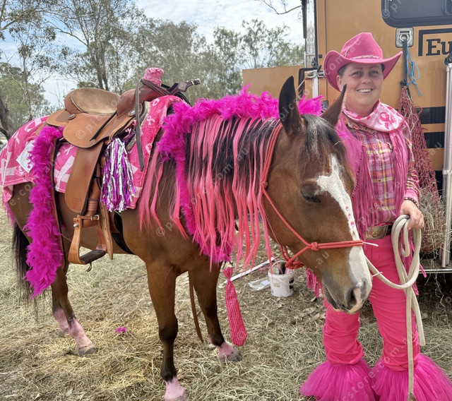 Kelly Smith from South Maclean with her horse Jimmy on Pink Cutting Day. (Larraine Sathicq: 509797_02)