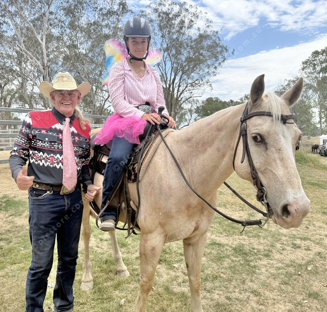 Don Lofthouse with Arianna Lweis on Creamy at the Beaudesert Cutting and Western Performance fundraiser. (Larraine Sathicq: 509797_06)