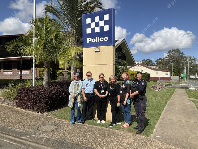 Larraine Sathicq and Senior Sergeant Wayne Griffith with Sara Vuzem and Kirsty Kohn from YFS, Taylor Reynolds YFS and Acting Sergeant Lia Bruhn at Jimboomba Police Station.