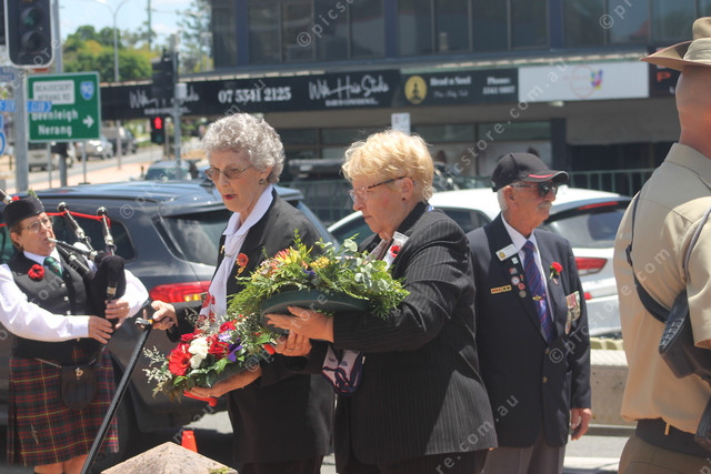 Janice and Joanne Heit lay wreaths at the Beaudesert cenotaph on behalf of the RSL Sub Branch women’s auxiliary. (Larraine Sathicq: 516854_08)