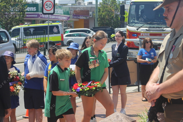 Year 6 students Jackson Deacon and Ava Williams lay a wreath on behalf of Woodhill State School on Remembrance Day in Beaudesert. (Larraine Sathicq: 516854_11)