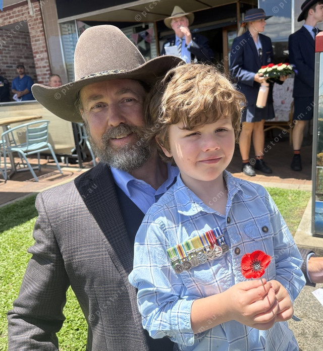 Beaudesert veteran Travis Holt and his son Ethan, 5, pay their respects on Remembrance Day. (Larraine Sathicq: 516854_14)