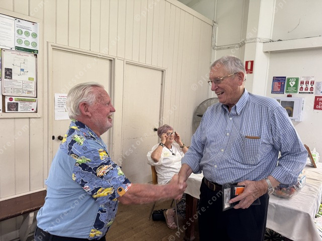 Tony Cash catches up with Llyod Venz at the 73rd Beaudesert Reunion. (Larraine Sathicq: 465807_04)