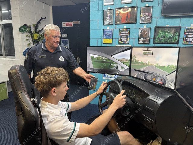 Senior Constable Tony Fishburn gives Benji Vonhoff a lesson on the possible consequences of using a mobile phone while driving. (Larraine Sathicq: 504332_04)