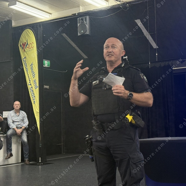 Beaudesert police station officer in charge Ken Murray speaks to young people about road safety. (Larraine Sathicq: 504332_05)
