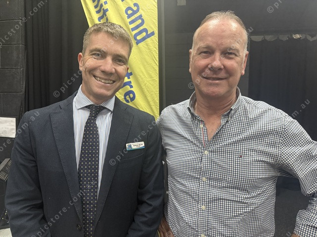 Beaudesert State High School Principal Damien Burke with former race car driver Mark Larkham at the YACC driver safety event. (Larraine Sathicq: 504332_09)