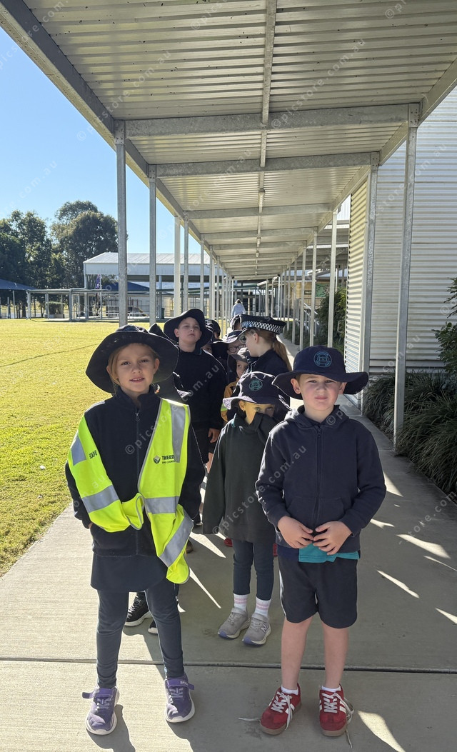 Students line up to meet firefighters and police at school. (Larraine Sathicq: 484119_03)