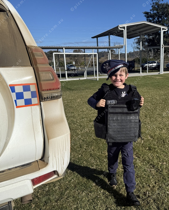 Atticus Hartley tries on some police safety gear. (Larraine Sathicq: 484119_06)